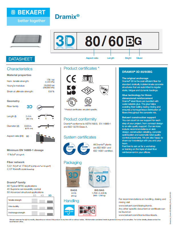 Sợi thép cho hỗn hợp bê tông Dramix 3D. Là sợi có hình dạng và cắt thành từng đoạn dài để gia cố bê tông, vữa và các vật liệu composite khác. Cung cấp khả năng kiểm soát vết nứt tối ưu cho các kết cấu bê tông không xác định tĩnh tiêu chuẩn chịu được các điều kiện tĩnh, mỏi và động thường xuyên. Dòng Dramix 3D được thiết kế để có hiệu suất sử dụng vượt trội và được tối ưu hóa cho các giải pháp gia cố kết hợp.