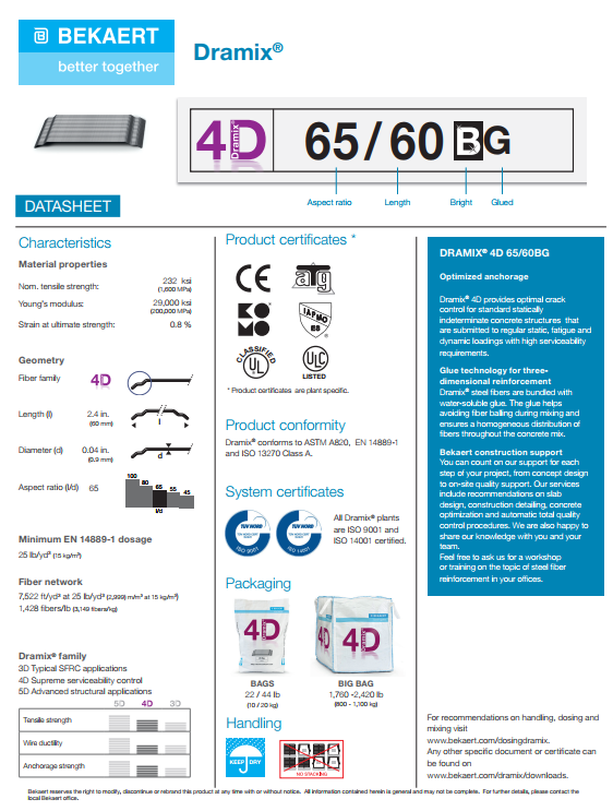 Sợi thép cho hỗn hợp bê tông Dramix 4D. Là sợi có hình dạng và cắt thành từng đoạn dài để gia cố bê tông, vữa và các vật liệu composite khác. Cung cấp khả năng kiểm soát vết nứt tối ưu cho các kết cấu bê tông không xác định tĩnh tiêu chuẩn chịu được các điều kiện tĩnh, mỏi và động thường xuyên. Dòng Dramix 4D được thiết kế để có hiệu suất sử dụng vượt trội và được tối ưu hóa cho các giải pháp gia cố kết hợp.